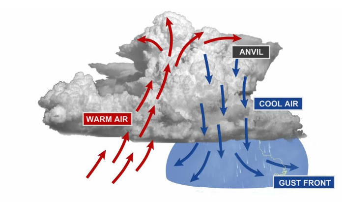 뇌우 또는 슈퍼셀의 성숙의 단계를 거치는 동안 폭우, 번개, 우박, 강한 바람이 나타납니다. 때로 비가 내리기 몇 분 전에 강한 돌풍이 일어납니다. 이것은 돌풍 전선이라고 합니다. 이것은 폭풍 구름에서 차가운 공기가 강제로 내려오기 때문에 발생합니다. 차가운 공기가 땅에 닿으면 폭풍보다 빠르게 퍼집니다. 이것은 폭풍이 다가오고 있다는 신호입니다.